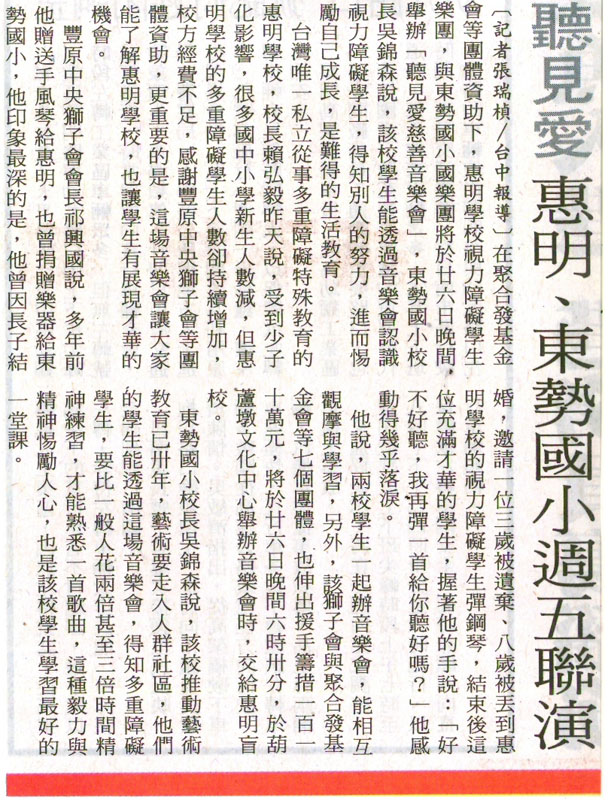 [自由時報] 聽見愛 惠明、東勢國小周五聯演 ...