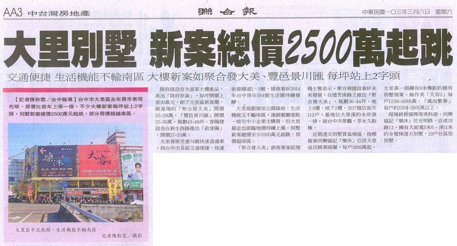 [聯合報] 大里別墅 新案總價2500萬起跳 ...