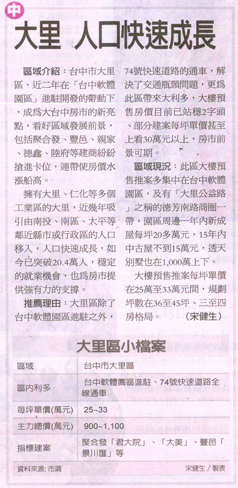 [經濟日報] 大里 人口快速成長 ...