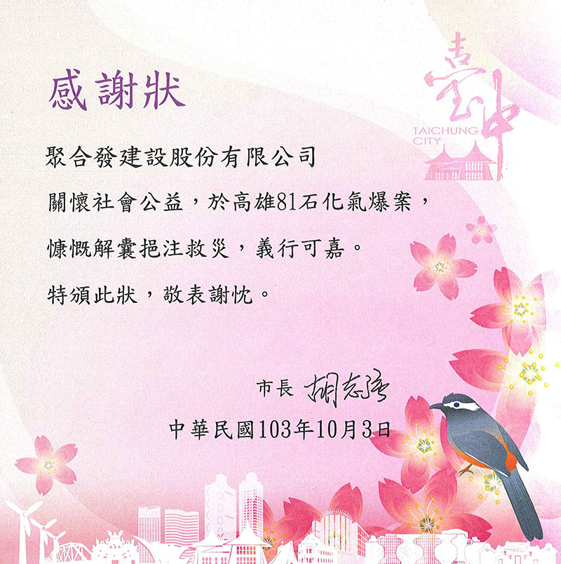 臺中市政府頒發高雄氣爆捐款感謝狀儀式。